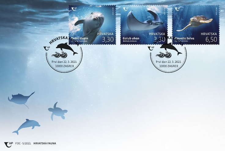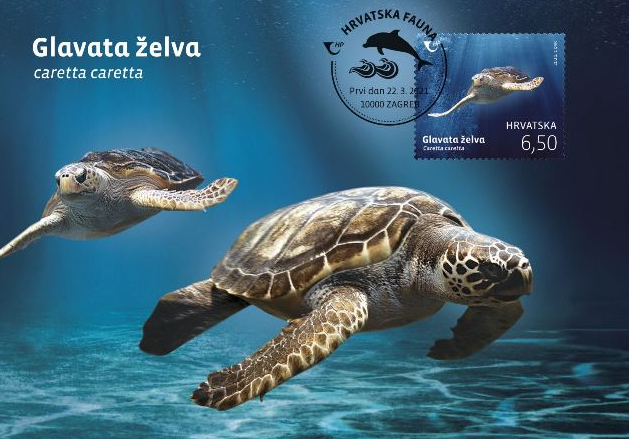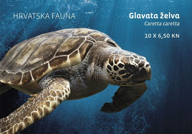 The leading project partner of the EU project Life Euroturtles, the Croatian Natural History Museum, in cooperation with the Croatian national postal operator – HR Pošta, published a commemorative postage stamp set with the motif of a loggerhead turtle. The set includes a postal sheet of 20 stamps with the project logo printed on the edge of the sheet, a brochure with the accompanying text and also a commemorative envelope on the first day (FDC).